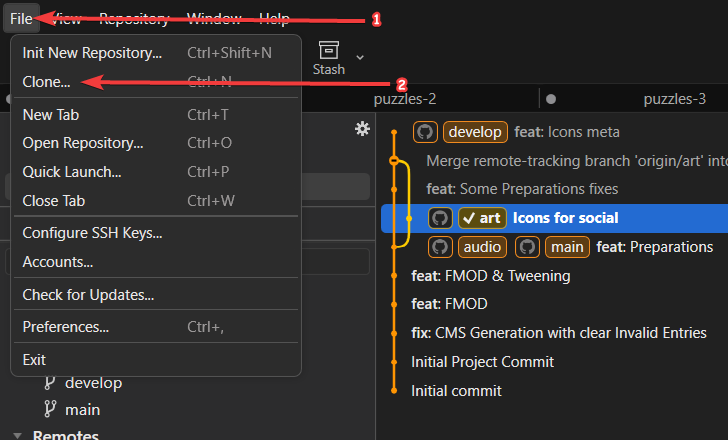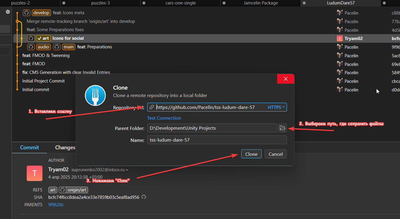 - После выбираем адрес репозитория, папку с проектами и название папки проекта: